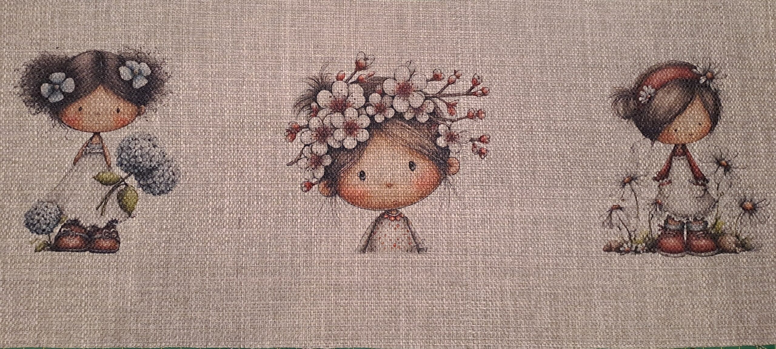 Tessuto 20×48 con stampate tre bambine con fiori su base naturale