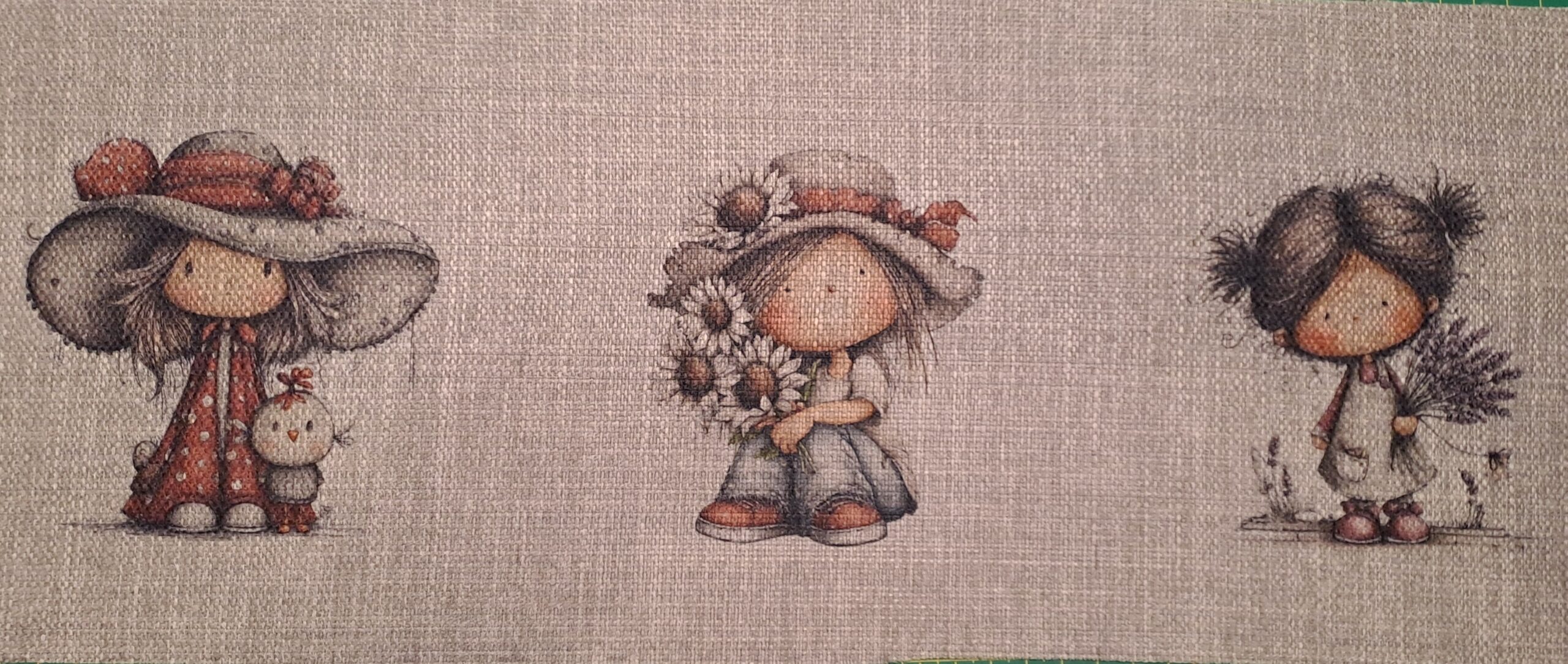 Tessuto 23×48 con stampate tre bambine con fiori su base naturale