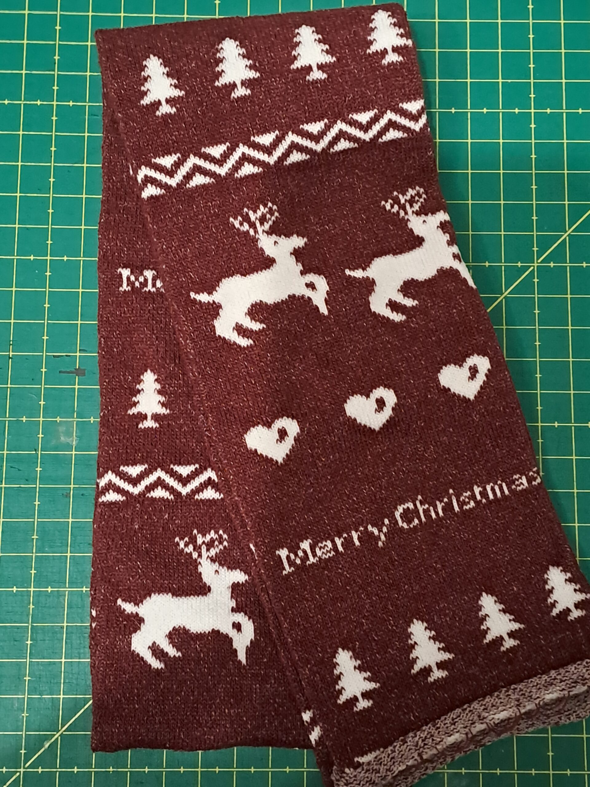 tubolare lungo circa 1mt color bordeaux con motivi natalizi a strisce largo 8cm